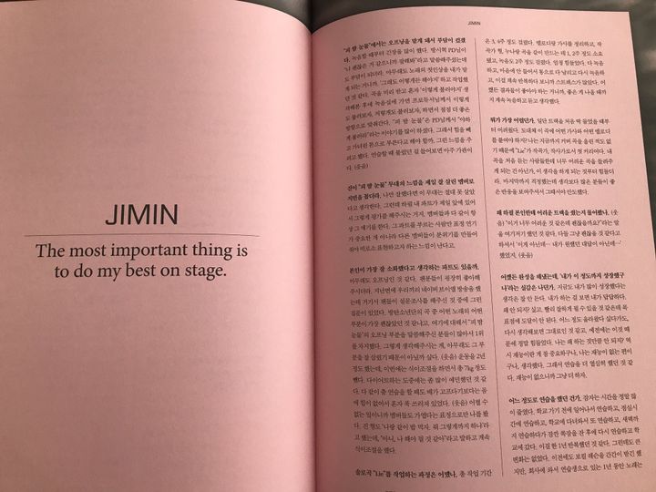 Jimin (La chose la plus importante est de faire de mon mieux sur scène) : Nous sommes des chanteurs, nous performons tous, n'est-ce pas ? Faire de mon mieux en pensant que je n'ai rien à offrir à part ma performance, je crois que c'est important de ne pas perdre cette pensée.